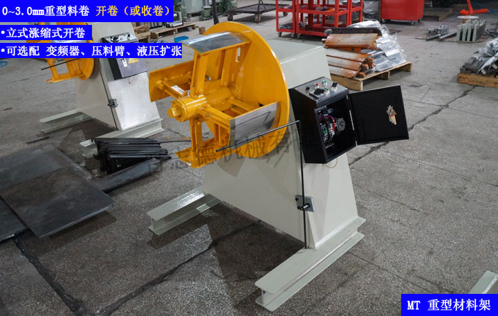 7、重型材料架承載量大,上料簡便,運行平穩,由感應架自動控制材料架的開停,無需人工看管,自動化程度高,同時可根據客戶需求加裝壓料臂、油壓擴張,大的提高了沖壓生產線效率和沖壓制品的品質,是沖壓生產線理想的放料、開卷設備。