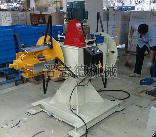 在目前的沖壓生產(chǎn)過程中,多數(shù)采用的是重型材料架來放置料卷,重型材料架由基座與安裝在基座上的主軸兩大結(jié)構(gòu)組件組成,其中主軸上另外設(shè)置有靠背輪、托塊、漲縮卷筒,卷料通過套在主軸漲縮卷筒上來實(shí)現(xiàn)放料與開卷,重型材料架在使用時(shí),當(dāng)一卷材料用完后,則需將整個(gè)生產(chǎn)線停止下來重新裝載卷料,由于材料架承載卷料重量大,因此需很長的裝料時(shí)間,大地限制了整個(gè)沖壓生產(chǎn)線的有效工作時(shí)間;另一方面,重型材料架這種單軸放料方式為保證轉(zhuǎn)矩的均勻,主軸只能設(shè)置于基座的中央,這樣雖不會(huì)出現(xiàn)轉(zhuǎn)軸松動(dòng)、傾斜的現(xiàn)象,但會(huì)導(dǎo)致裝料的十分不便。