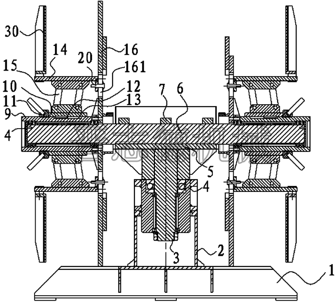 雙頭材料架支承座呈圓筒狀,在支承座的內(nèi)側(cè)面設(shè)有導(dǎo)向鍵,在套管上設(shè)有導(dǎo)向槽,導(dǎo)向鍵設(shè)置在導(dǎo)向槽內(nèi),實(shí)現(xiàn)支承座和支撐軸之間軸向滑動(dòng)周向固定連接。在支承座的外圍設(shè)有四塊撐板,支承座與每塊撐板之間均設(shè)有兩根傾斜設(shè)置且相互平行的鉸接桿,每根鉸接桿的一端軸接在撐板上,另一端軸接在支承座上。
