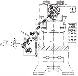 滾輪送料機的輥軸1和2固定在沖床工作臺上,通過偏心輪8、連桿7和單向離合器5等的驅動,輥軸工作周期性的轉動,間歇地把材料送進,上輥軸1除轉動外,還可垂直移動,靠彈簧6壓在下輥軸上,由于輥軸與帶料間摩擦力作用,使輥軸夾持料3向前送進。