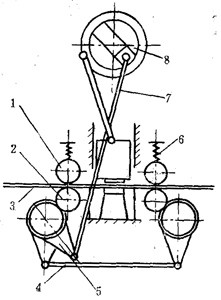 1-上輥軸; 2-下輥軸; 3-夾持料; 4-連桿; 5-離合器; 6-彈簧; 7-連桿; 8-偏心輪