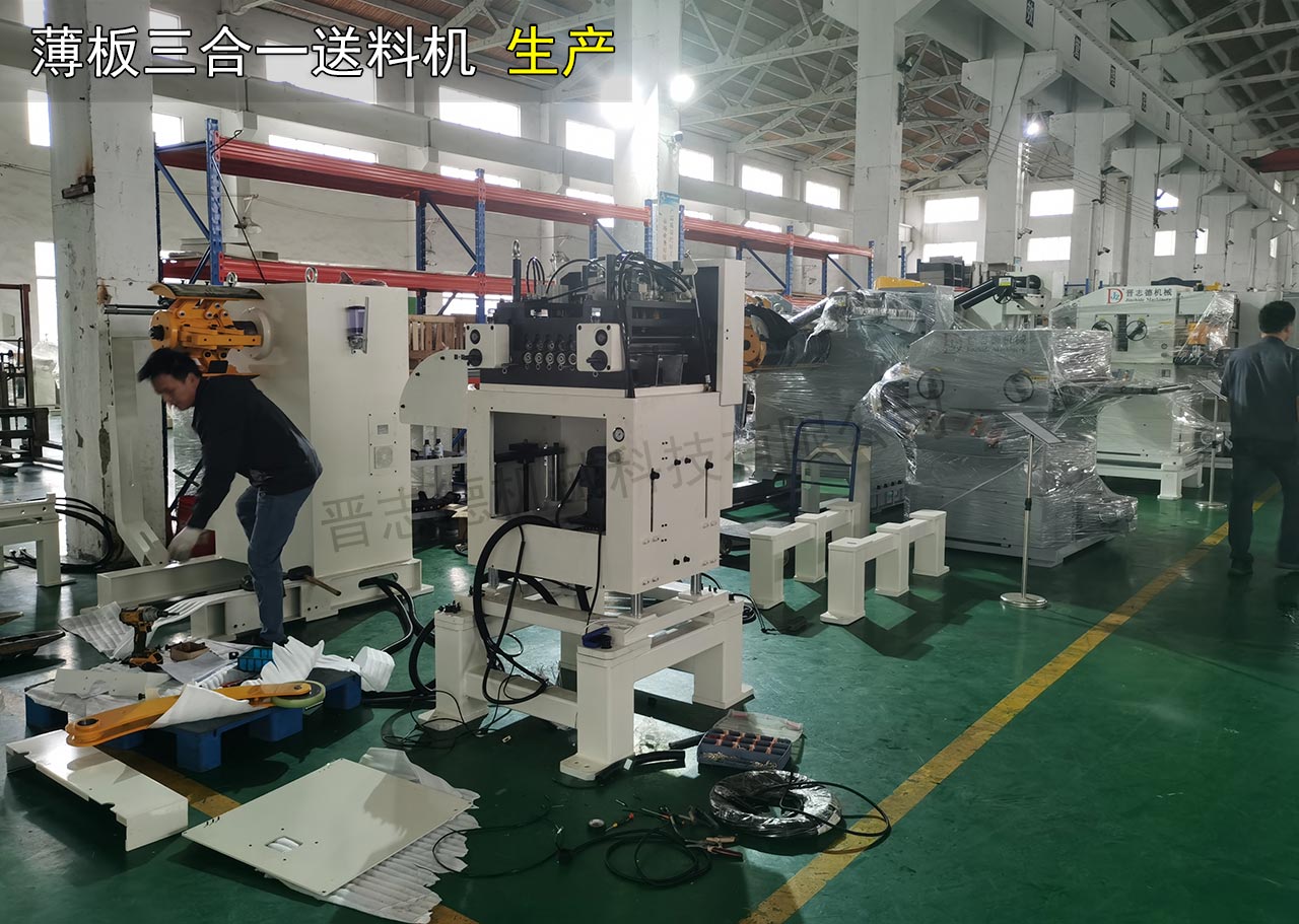 目前,國內送料機生產廠家很多,但能生產大型沖壓自動化設備的企業屈指可數,而且高端送料機少之又少。為此,晉志德機械推出三合一送料機,其集料架、整平、送料于一體,配有晉志德自開發的控制模快的裝置,相較于傳統材料架+整平機+送料機分體組成的沖壓生產線,使用三合一送料機能大的節省廠房空間、提高沖壓成品品質、簡化操作流程,是目前為沖床材料供給的佳自動化模式。