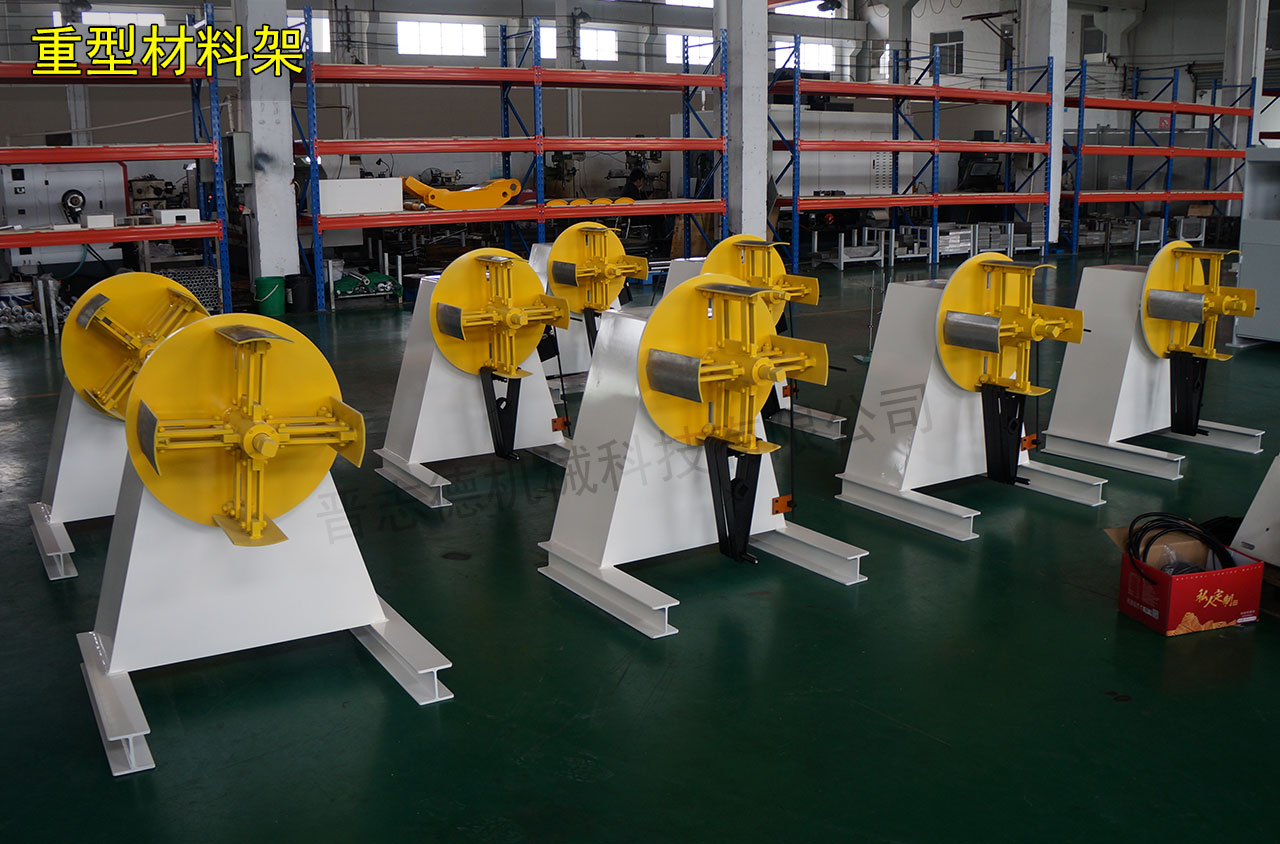重型材料架具有價(jià)格經(jīng)濟(jì)實(shí)惠、載重量大、定制化程度高、故障率低、操作簡易、維護(hù)方便等優(yōu)點(diǎn),是卷狀板材實(shí)現(xiàn)自動(dòng)化生產(chǎn)常用的放料、開卷設(shè)備,它即可搭配整平機(jī)、送料機(jī)組成完整的沖壓生產(chǎn)線,也可直接與送料機(jī)配合組成簡易型沖壓生產(chǎn)線,同時(shí)可作收料之用途。